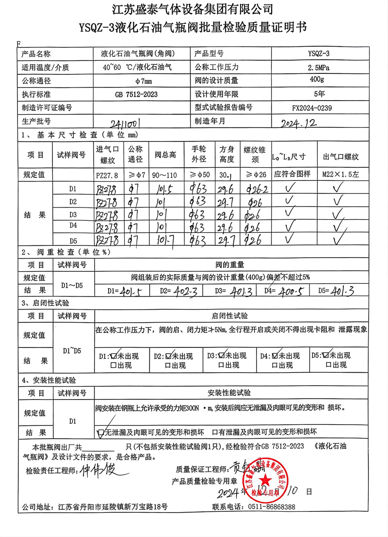 江苏盛泰气体设备集团有限公司 YSQZ-3液化石油气瓶阀批量检验质量证明书